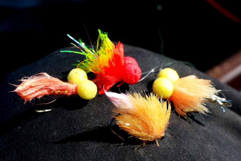 The morning temperature was still cool despite the early morning sun so I chose to set up with a slow intermediate line blob top dropper, dabbler in the middle and a cat booby on the point. A great combination when searching for fish high in the water. The water was slightly coloured from the weed dying back, so a few flies fished close to the surface should gather any fishes attention. The flies were strung together on 8lb G3.
